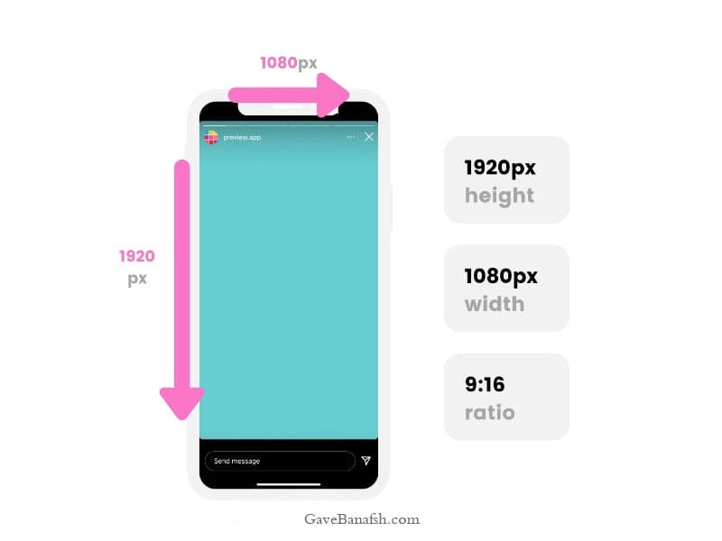 به طور کلی ابعاد استوری اینستاگرام ۱۹۲۰*۱۰۸۰ پیکسل است. یعنی تصویر یا ویدیوی شما باید ۱۰۸۰ پیکسل عرض و ۱۹۲۰ پیکسل ارتفاع داشته باشد. نسبت تصویر نیز به صورت ۹:۱۶ شناخته می‌شود.