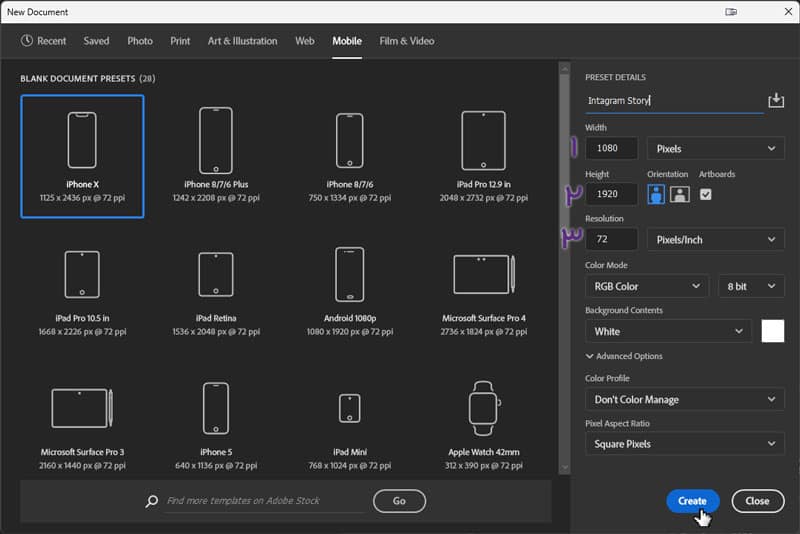 فتوشاپ قدرتمندترین ابزار ویرایش عکس است و از آن برای طراحی قالب استوری اینستاگرام استفاده می‌شود. سایز استوری اینستاگرام در فتوشاپ نیز دقیقا ۱۰۸۰×۱۹۲۰ است. شما برای طراحی استوری اینستاگرام در فتوشاپ باید فایلی با ابعاد ۱۰۸۰×۱۹۲۰ پیکسل بسازید. برای اینکار از منوی فایل، گزینه New را انتخاب کنید و در صفحه باز شده مطابق تصویر زیر گزینه width را برابر با ۱۰۸۰، گزینه height را برابر با ۱۹۲۰ و گزینه رزولوشن را برابر با ۷۲ قرار دهید.