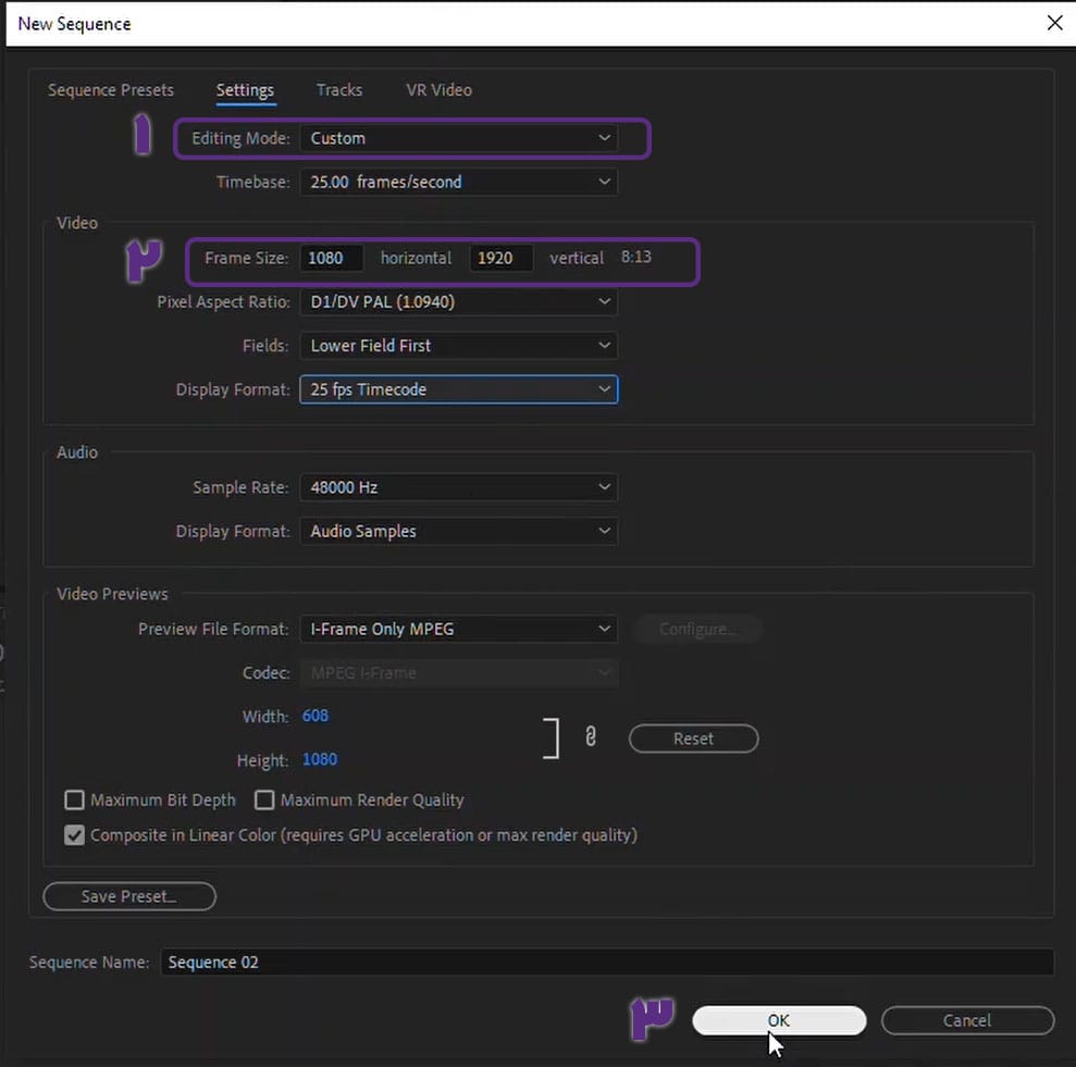 اسکرین شات از صفحه تنظیمات اندازه ویدیو در پریمیر و تنظیمات ابعاد مناسب برای استوری