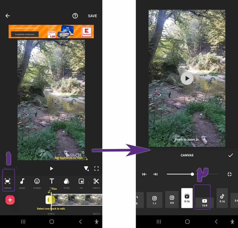 برای انتخاب ابعاد درست ابتدا گزینه canvas را انتخاب کنید، سپس گزینه ۹:۱۶ را انتخاب کنید و روی ✔ بزنید.